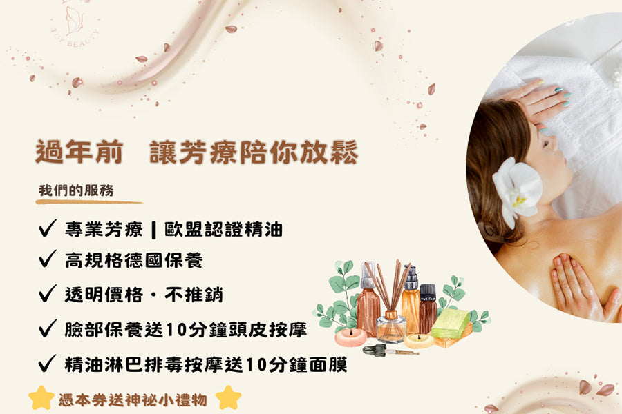 過年前,讓芳療陪你一起好好放鬆。我們為忙碌一整年的你,準備了專業又安心的芳療保養服務,在溫柔的節奏中,釋放身體與情緒的緊繃感。